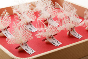縁結び玉の代わりに、おふたりのご縁が長く、堅くつづくよう祈願した特別なお守りを差し上げます。